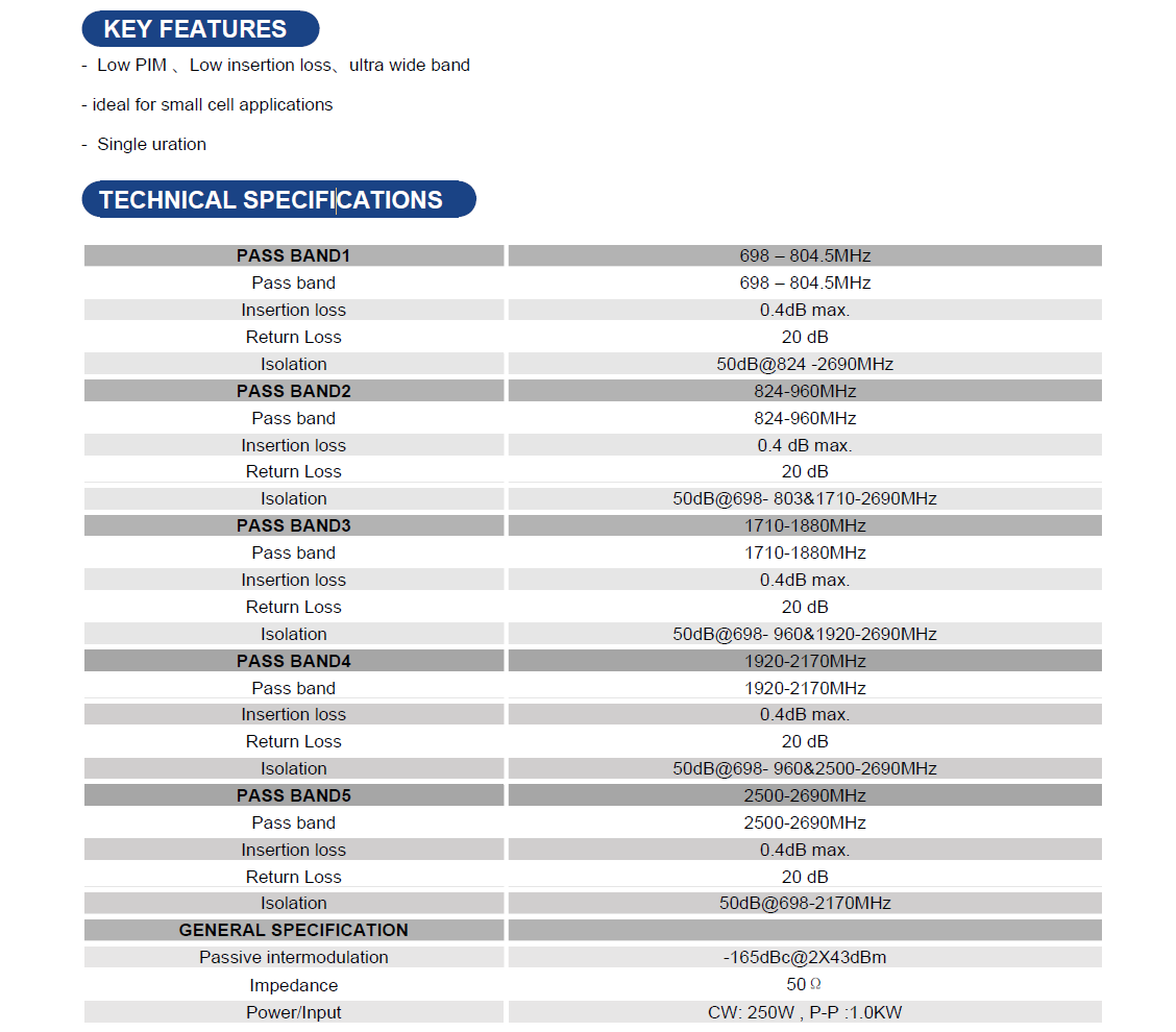 Low PIM 、Low insertion loss、ultra wide band 、ideal for small cell applications、 Single uration